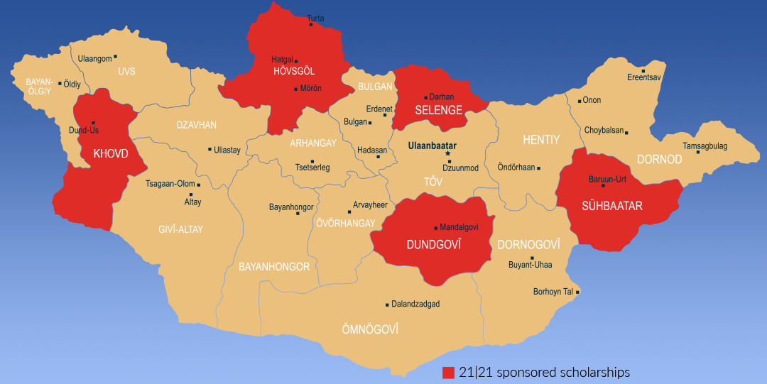We are in the beginning stages of the 21|21 Initiative. Our Goal is to deliver a one-year scholarship for deserving Mongolian students for each province of Mongolia by the 2025-2026 academic year. As we progress towards a Mongolian scholar for each province, you will have a chance to learn more about them, their course of study, and their goals for the future. Could you help us fill in the blanks?